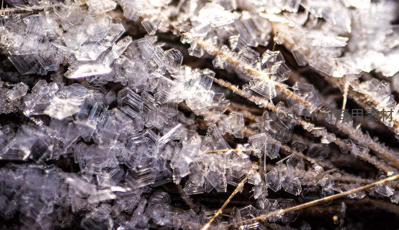 在微距镜头下,草叶上凝结的霜花展现出令人惊叹的几何形态。每一颗冰晶都如精雕细琢的宝石,透明而锐利,在阳光下闪烁着冷冽的光芒,展现了微观世界的极致之美。