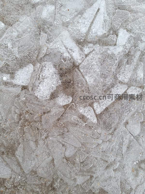 微距镜头下,冰层表面形成独特而精致的晶体结构,透明与半透明交织,展现了大自然鬼斧神工的微观艺术。