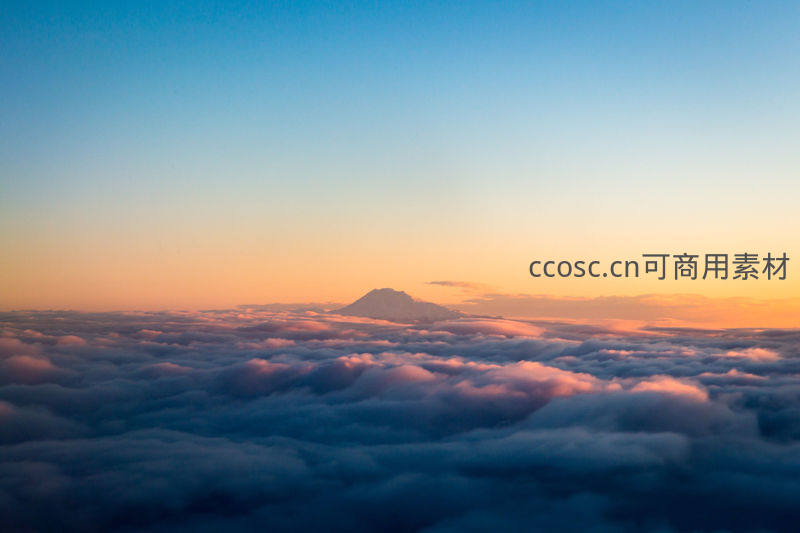 夕阳西下,天边橙黄渐变,一座孤峰静静矗立于云海之上,如一幅宁静致远的山水画卷,令人心旷神怡。