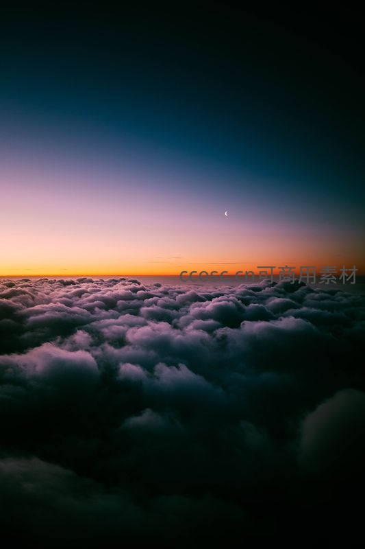 夕阳西下,云海被染成紫橙渐变,一弯新月悄然悬于深蓝天幕,构成一幅宁静而诗意的高空黄昏画卷。