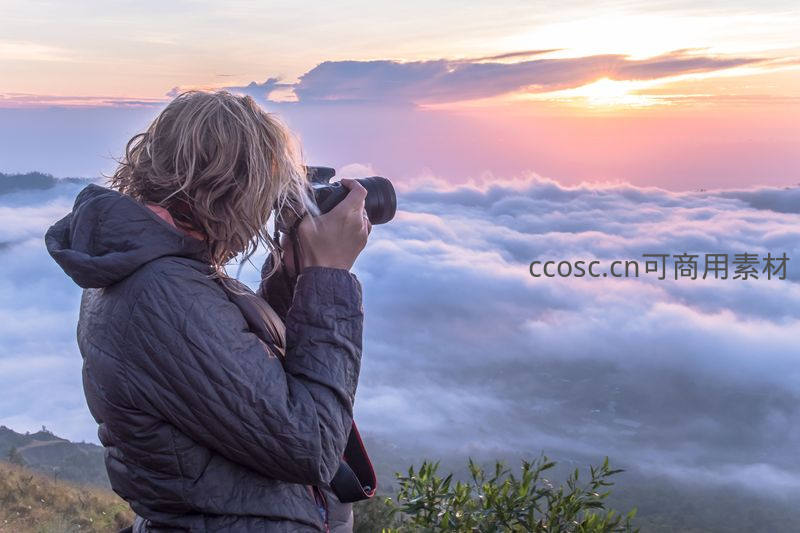一位摄影师背对镜头,手持相机专注拍摄前方翻滚的云海与初升的朝阳,记录大自然最动人的瞬间。