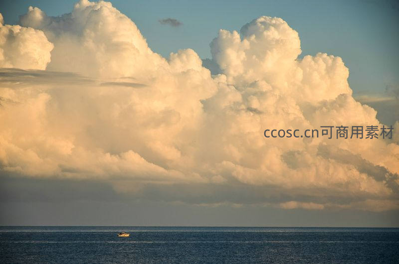 广阔海面上,一艘小船静静漂浮,头顶是被夕阳染成金色的巨大云团,画面充满诗意与辽阔感,引人遐思。