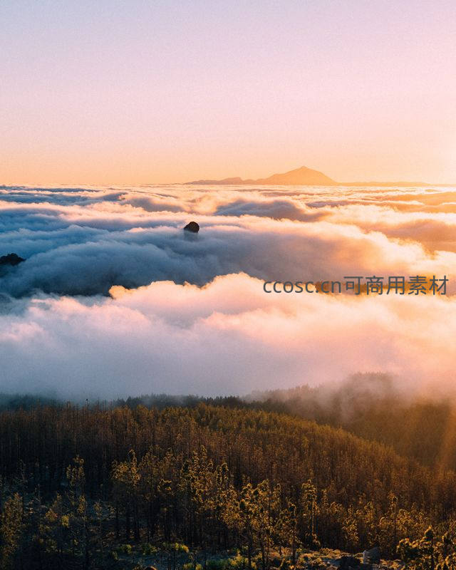 朝阳初升,柔和的金光穿透云层,将漫山遍野的云海染成粉橙色。下方是静谧的森林,远处山峰若隐若现,宛如一幅诗意的山水画。