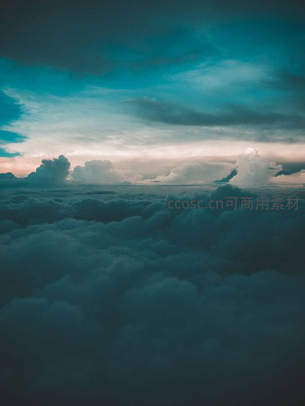 从高空俯瞰,无垠的云海如一片凝固的海洋,冷色调的蓝与灰交织,营造出一种超脱尘世、静谧而神秘的氛围。