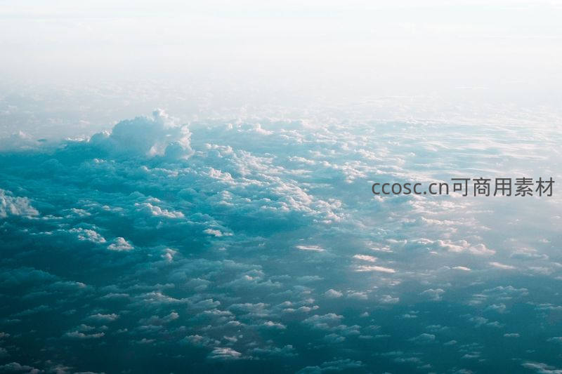 从万米高空向下凝望,大片云朵铺展成一片蔚蓝色的海洋,边缘泛着柔和白光,仿佛置身于一个宁静而神秘的异世界。