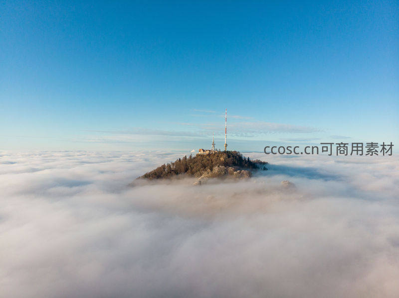 一座孤峰从茫茫云海中拔地而起,山顶上建筑与通讯塔清晰可见,在澄澈蓝天的映衬下,宛如悬浮于空中的神秘楼阁,意境悠远。