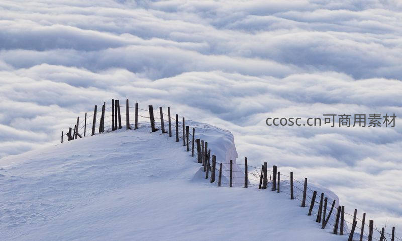 皑皑白雪覆盖山脊,一道木质围栏沿着山势蜿蜒伸展,下方是无边无际的云海,仿佛通向天际的秘径,意境超然脱俗。