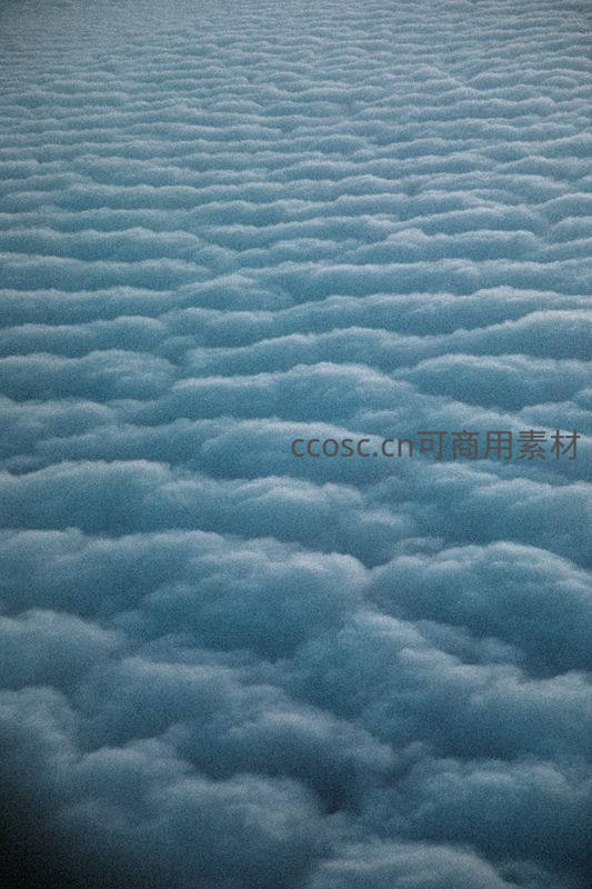 从高空视角看去,大片云层排列如规则的波浪纹理,蓝灰色调交织,呈现出极具韵律感的自然抽象画面,充满视觉张力。