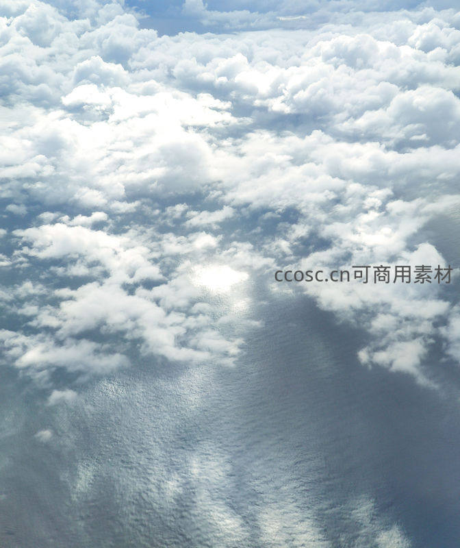 从高空俯瞰,洁白蓬松的云朵如棉絮般铺满天际,阳光穿透云层,在深蓝海面上投下斑驳光影,营造出梦幻而宁静的视觉盛宴。