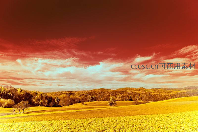 夕阳西下,整片大地被染成金黄色,远处山峦起伏,树木在暖光中轮廓分明,天空如燃烧般绚烂,充满诗意的秋日画卷。