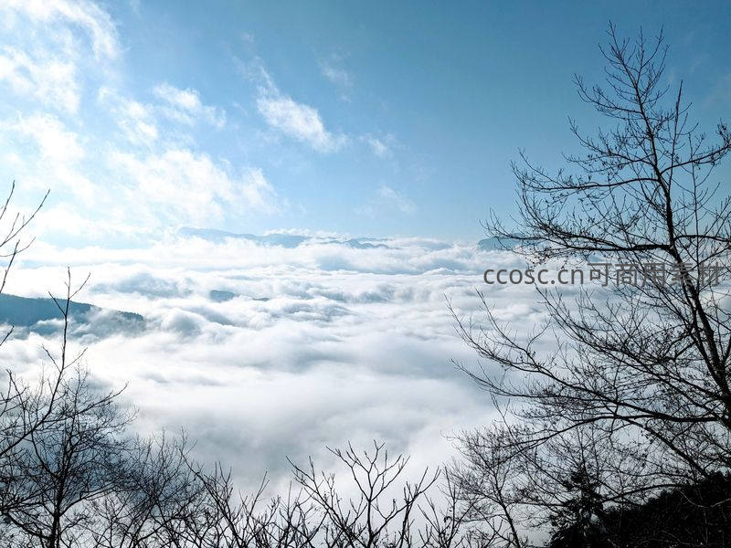 站在高处俯瞰,浩瀚云海如波涛般翻涌,几株光秃的树枝勾勒出优美的剪影,蓝天澄澈,展现出大自然的宏伟与静谧。