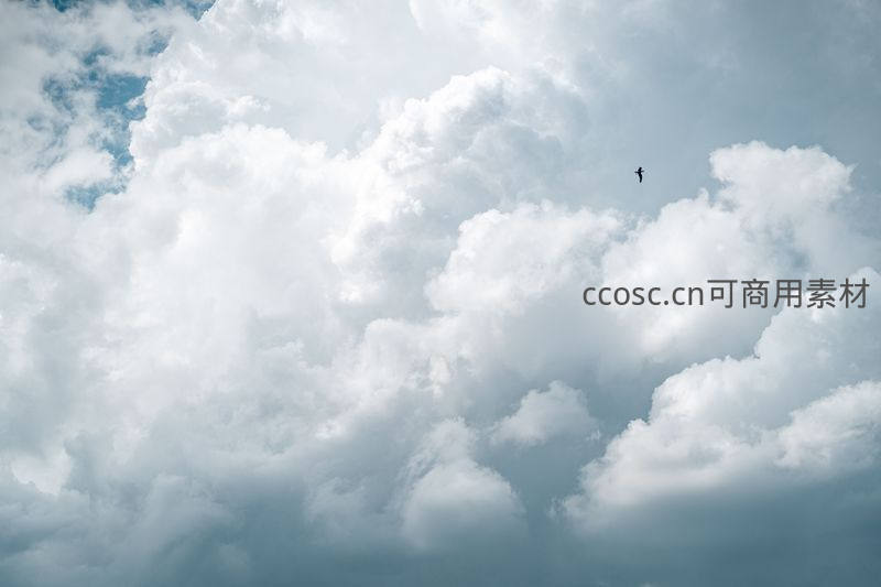 一只孤独的飞鸟划过浩瀚蓝天,穿梭在蓬松洁白的云朵之间,象征着自由与无垠,画面简洁而富有诗意。