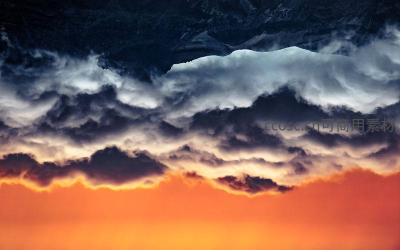 日落时分,橙红色的晚霞与深沉的暗云激烈碰撞,形成层次分明、色彩浓烈的天空奇观,令人叹为观止。