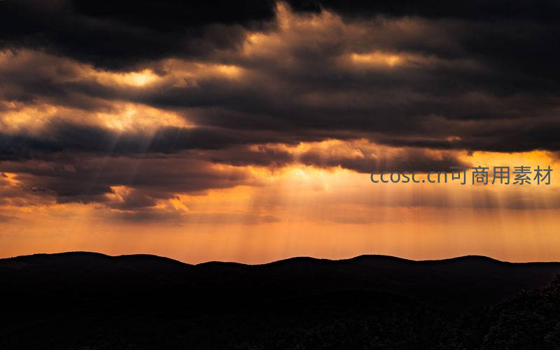 厚重的乌云裂开缝隙,金色的阳光如神迹般倾泻而下,照亮远方的山脊,前景的山峦化为深邃剪影,充满神圣感。