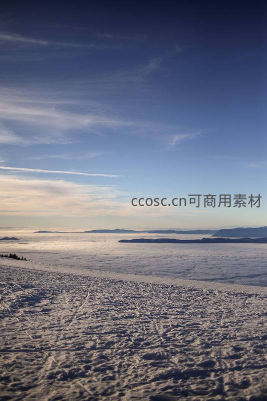 从雪坡高处俯瞰,云海如棉絮铺展,远方岛屿与山脉隐约浮现于云层之上,阳光洒落,画面空灵而开阔。