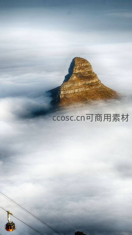 缆车缓缓穿越浩瀚云海,前方孤峰巍然耸立,岩壁清晰可见,宛如仙境中的守护者,令人叹为观止。
