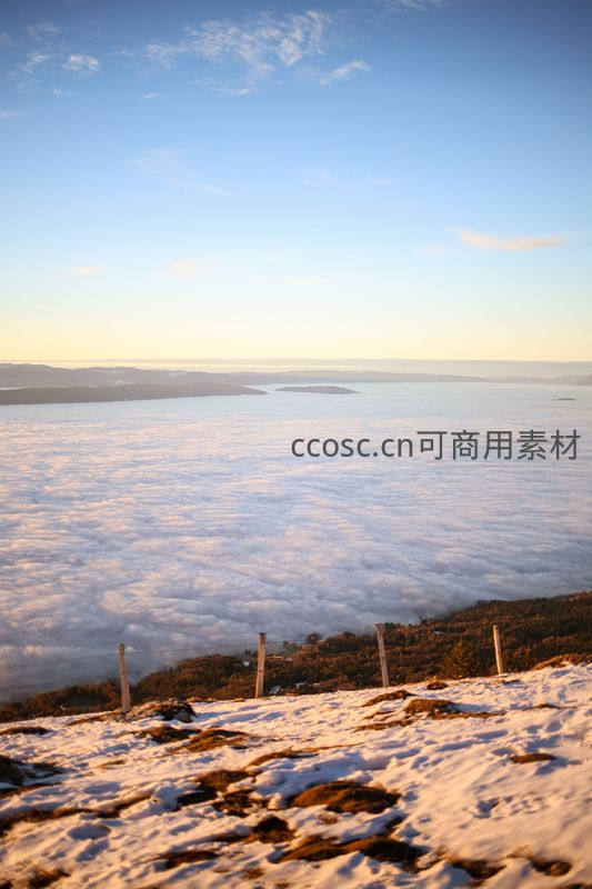 雪地边缘木桩围栏延伸,脚下是无垠云海,晨光温柔洒在云顶,远处山峦浮于云上,静谧而诗意盎然。