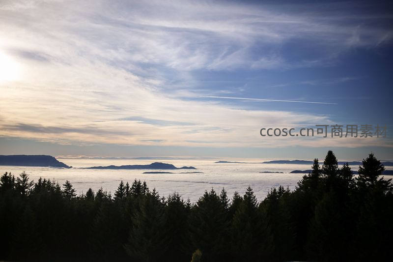 深色针叶林剪影前铺展着无垠云海,远方岛屿若隐若现,天边朝霞初染,构成一幅静谧而辽阔的清晨画卷。