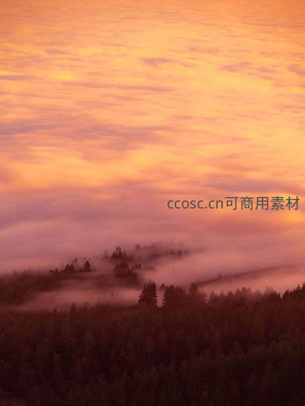 绚烂橙红色晚霞弥漫天际,薄雾轻柔缠绕苍翠山林,光影交错间营造出如梦似幻的秘境氛围,令人流连忘返。