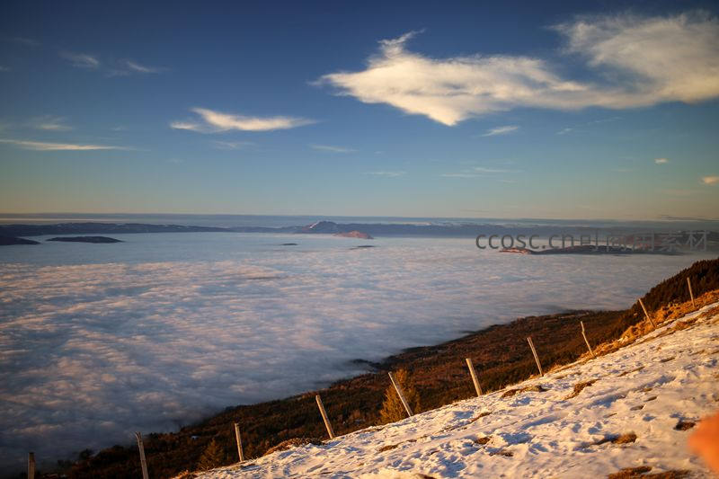 阳光照耀在覆雪的山坡上,前方是无垠的云海,远处岛屿般的山峰若隐若现,天地辽阔,静谧而震撼。