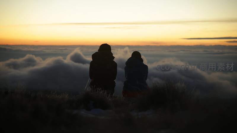 两人并肩坐在山顶草地上,背对镜头凝望云海与落日,温暖的光线勾勒出亲密轮廓,尽显浪漫与宁静。