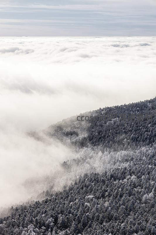 浓密的云雾轻柔缠绕着覆盖白雪的针叶林,山体轮廓在雾气中时隐时现,营造出一种静谧而神秘的氛围,仿佛置身童话世界。