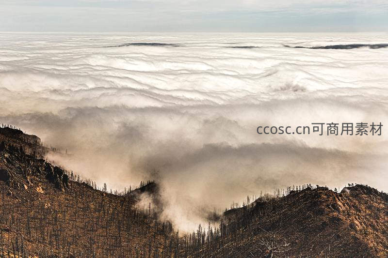 枯木覆盖的山脊刺破浩瀚云海,层层叠叠的云浪在山谷间涌动,光影变幻中诉说着大地沧桑与自然的磅礴气势。