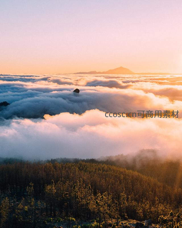 温暖的金色阳光洒在浩瀚云海上,远处山峰轮廓清晰,近处森林沐浴在柔和光线中,静谧而神圣。