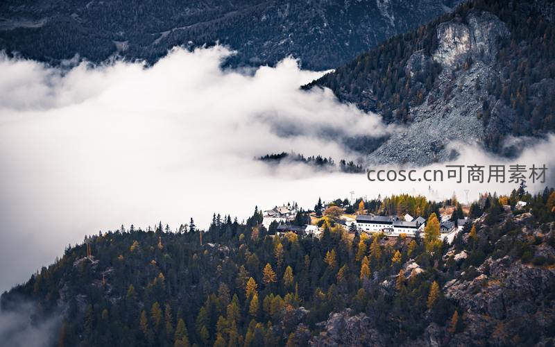 薄雾轻抚山腰,一座白色房屋点缀在五彩斑斓的秋林之间,仿佛遗世独立的童话村落,安详而美丽。
