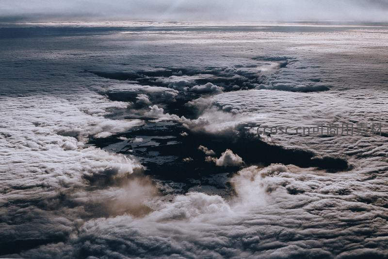 从高空俯瞰,层层叠叠的云海如波涛般翻滚,阳光穿透云层洒下斑驳光影,构成一幅气势恢宏的自然画卷。