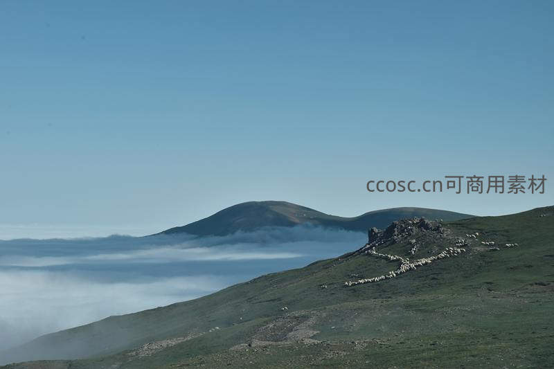 草原山丘上羊群漫步,云雾缭绕如仙境