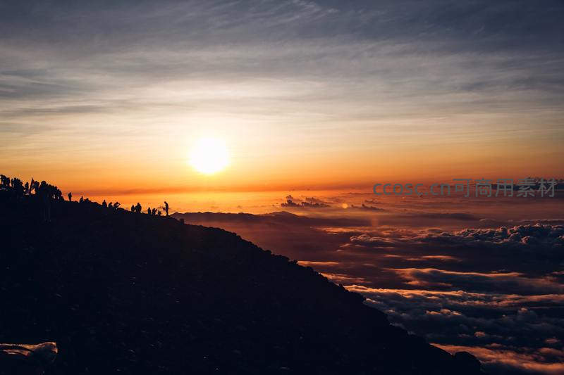 群山之巅,游客们迎着初升太阳伫立,金色光芒穿透云层,勾勒出人与自然和谐共存的瞬间。