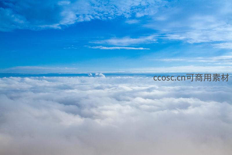 从高空俯瞰,洁白的云朵铺满视野,如同无边的海洋,上方是纯净的蔚蓝天空,带来开阔、自由与宁静之感。