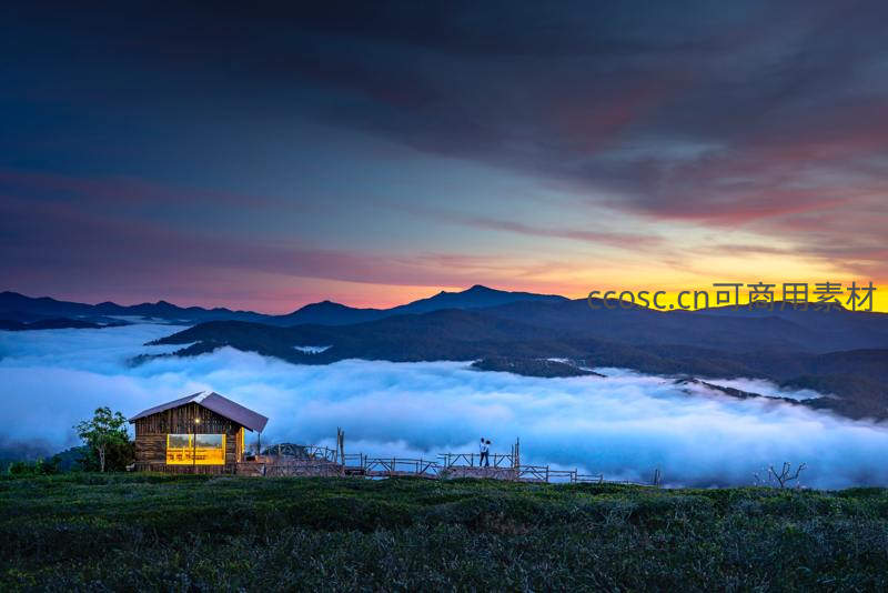 夕阳西下,天边染上绚烂彩霞,山巅小木屋亮起温暖灯光,脚下云海如梦似幻,远山轮廓朦胧,营造出浪漫而治愈的黄昏氛围。