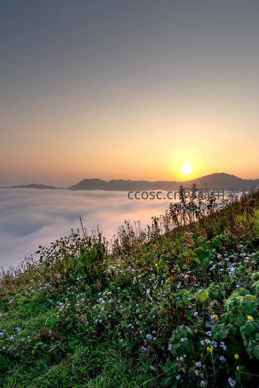 朝阳初升,金色光芒洒向山野,紫色小花在风中摇曳,脚下云海如棉絮般温柔铺展,远山剪影清晰,展现清晨大自然的生机与静美。