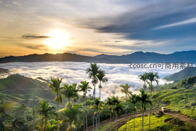 金色晨曦穿透云层,洒在起伏的绿色山坡上,高耸的棕榈树点缀其间,远处群山隐现于浩瀚云海之上,构成一幅宁静而壮丽的热带山景画卷。