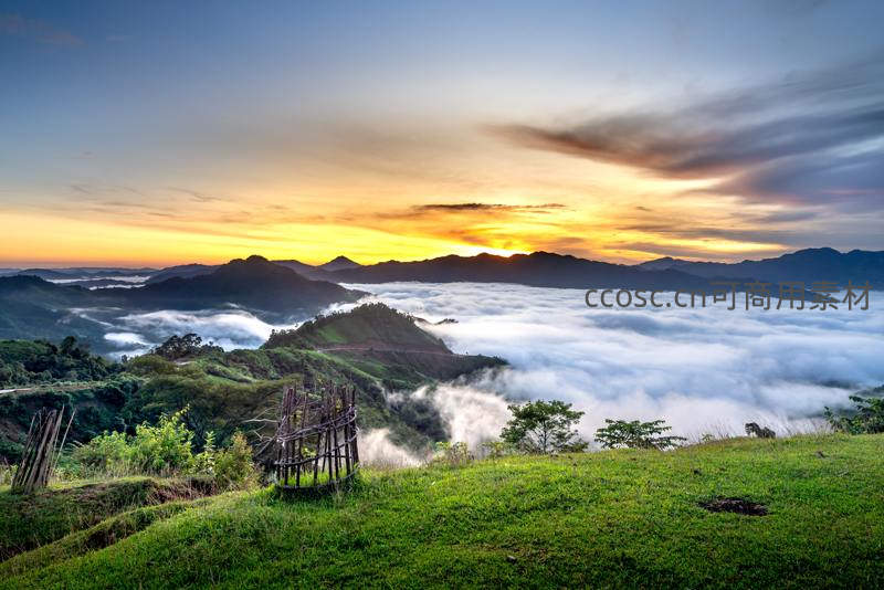 站在翠绿的山顶草甸上,眼前是无垠翻滚的云海,远方连绵的山脉在落日余晖中勾勒出温暖的轮廓,木制围栏静立一旁,尽显天地辽阔与时光静好。