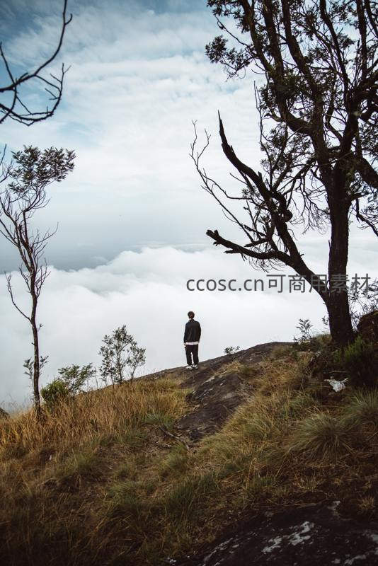 一位旅人背对镜头,独自站在岩石山顶,眺望着眼前铺展至天边的茫茫云海,身旁枯树虬枝,天空云卷云舒,传递着人与自然对话的哲思与静谧。