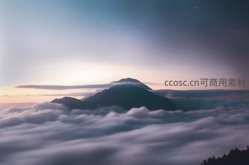 夕阳余晖染红天边,孤峰静立云海之上,薄雾轻绕如纱,远处星点初现,营造出超脱尘世、如梦似幻的诗意空间。
