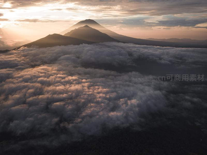 雄伟火山轮廓在晚霞映衬下清晰可见,脚下云海被染成金橙色,光影流动间展现大地之力与天空之美的震撼交响。