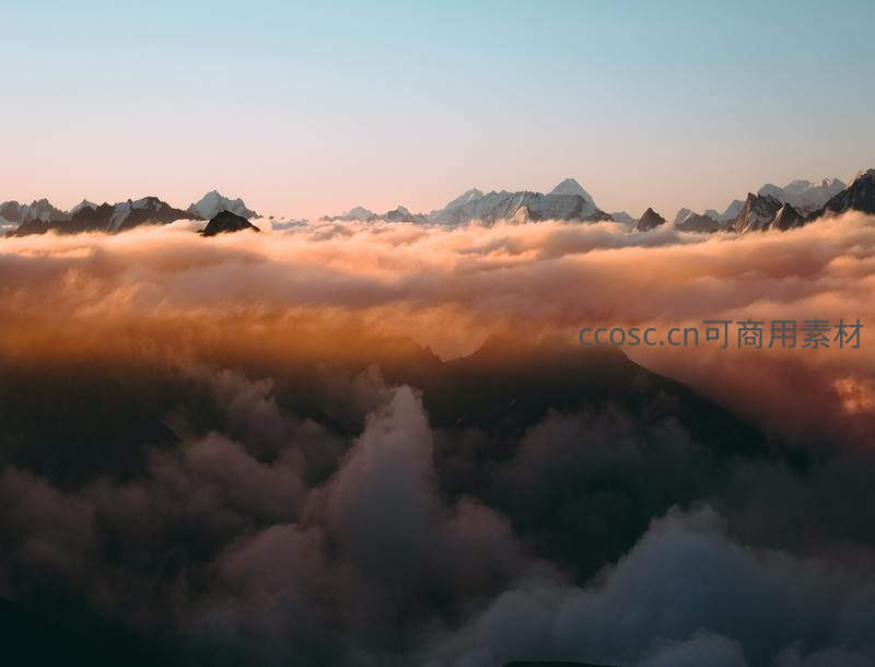 连绵雪峰刺破云海,夕阳余晖将云层染成橙红暖色,冷峻山体与柔和云霞交织,构成一幅气势恢宏又充满诗意的高原奇景。