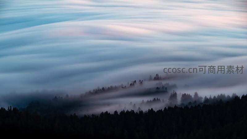 层叠的薄雾轻柔覆盖山林,树木轮廓若隐若现,宛如中国传统水墨画,散发着诗意与宁静之美。
