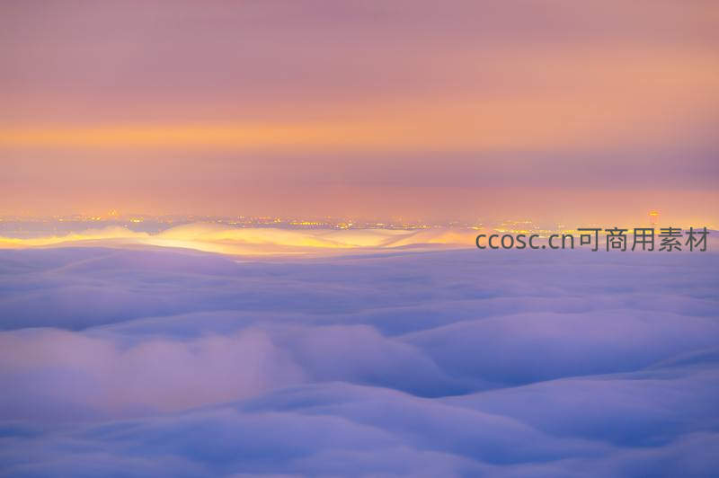 从高空俯瞰,层层云海如波涛翻滚,远方城市灯火点点,与霞光交融,营造出梦幻而静谧的氛围,仿佛置身仙境。