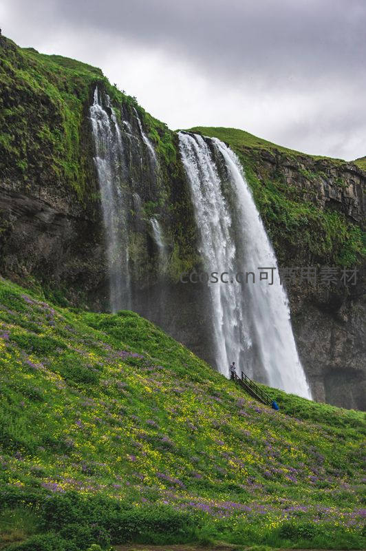宏伟瀑布从翠绿山崖倾泻而下,前方山坡开满紫黄野花,几位游客驻足观景,云层低垂,构成一幅壮丽又浪漫的自然画卷。