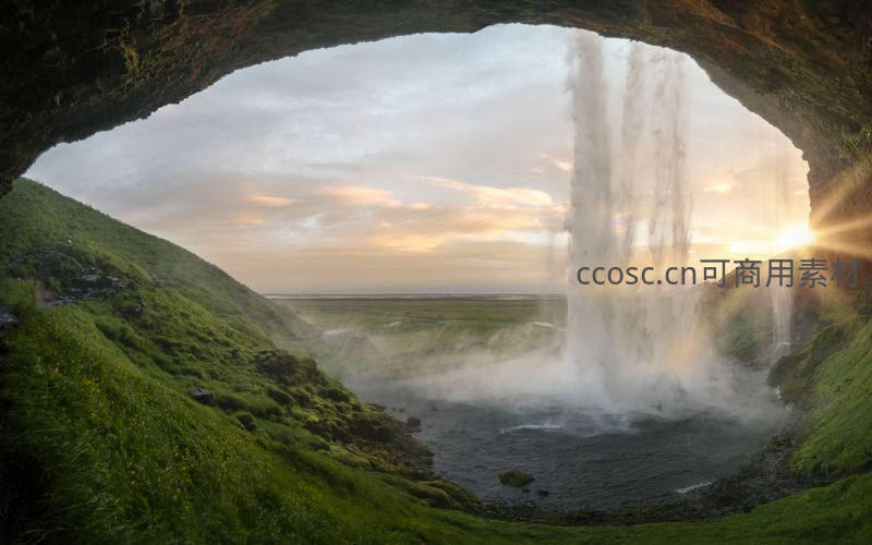洞穴内观瀑布,夕阳穿透水雾洒满绿谷