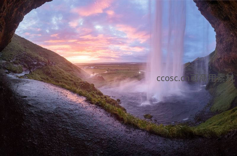 透过天然石洞的弧形边框,绚烂粉紫晚霞铺满天际,瀑布水幕在柔和光线中泛着柔光,地面湿漉漉反射着霞彩,宛如一幅精心构图的油画。