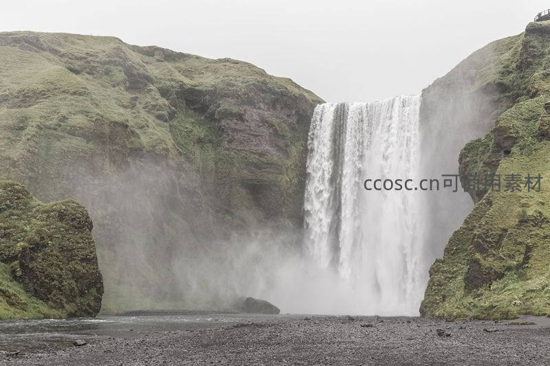一道宏伟瀑布从覆盖着厚厚苔藓的绿色峡谷峭壁上奔涌而下,激起漫天水雾,下方是灰黑色的砾石滩,展现了大自然原始而磅礴的力量。