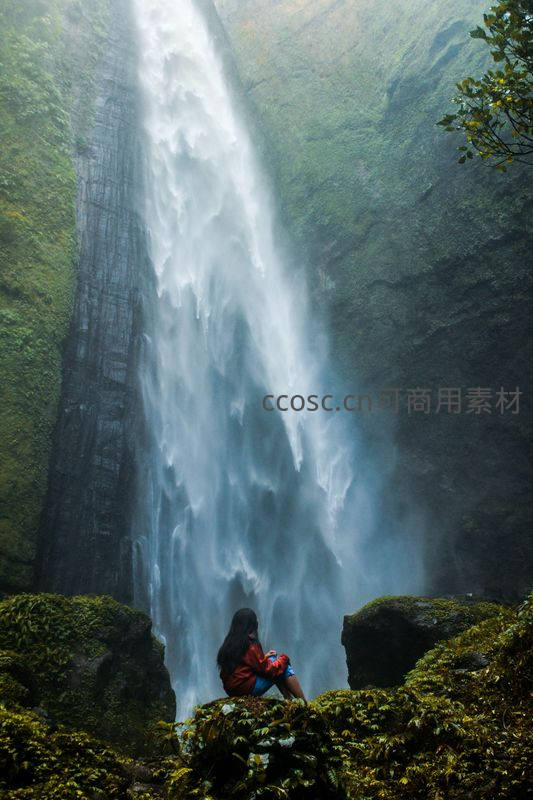 一位女子背对镜头坐在苔藓覆盖的岩石上,凝望面前气势磅礴的瀑布,四周绿意盎然,水声轰鸣中透着内心的平和。