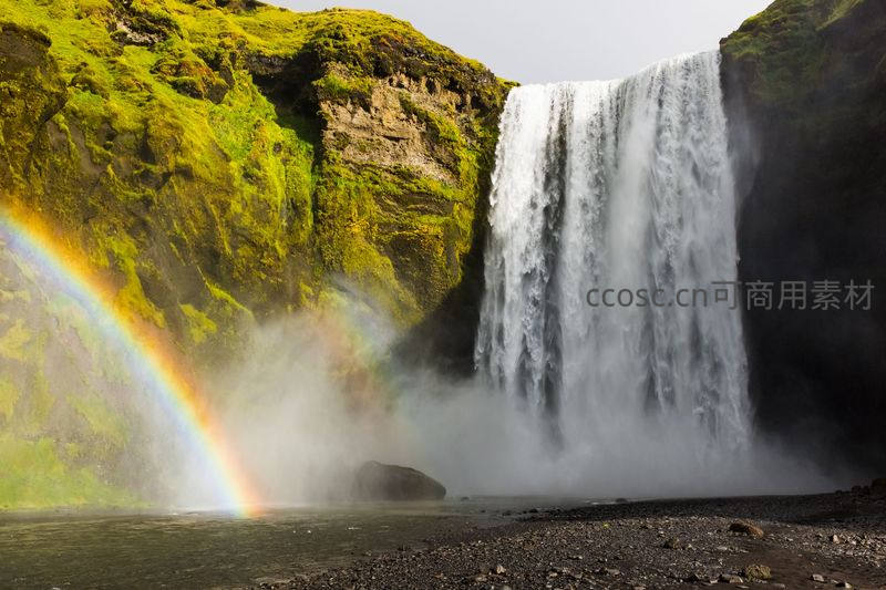 彩虹横跨瀑布前,绿崖映衬水幕如帘