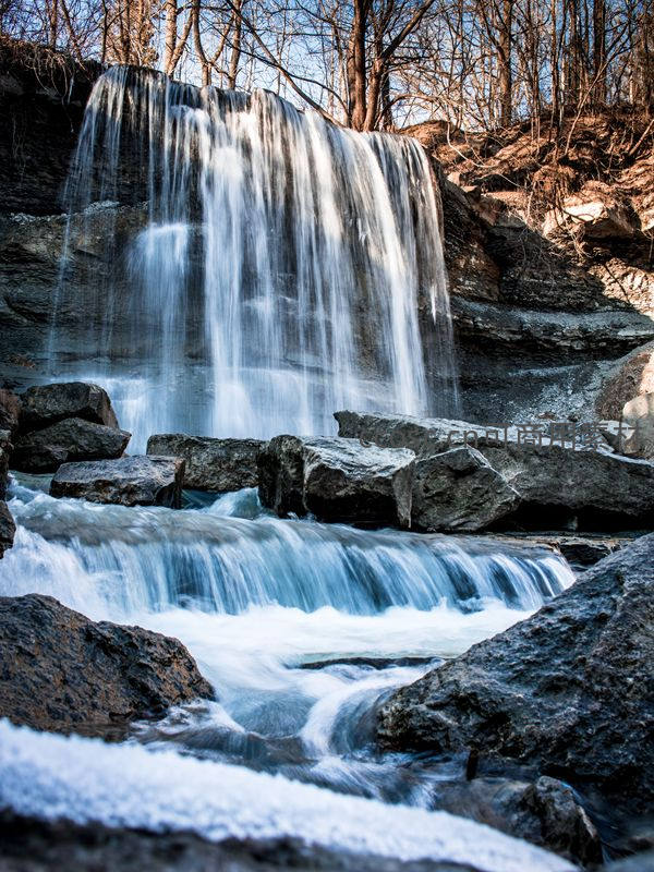 冬季的瀑布水流温柔如丝,缓缓滑过布满青苔的岩石,前景残留薄霜,背景枯树疏朗,尽显冬日山林的清冷雅致。